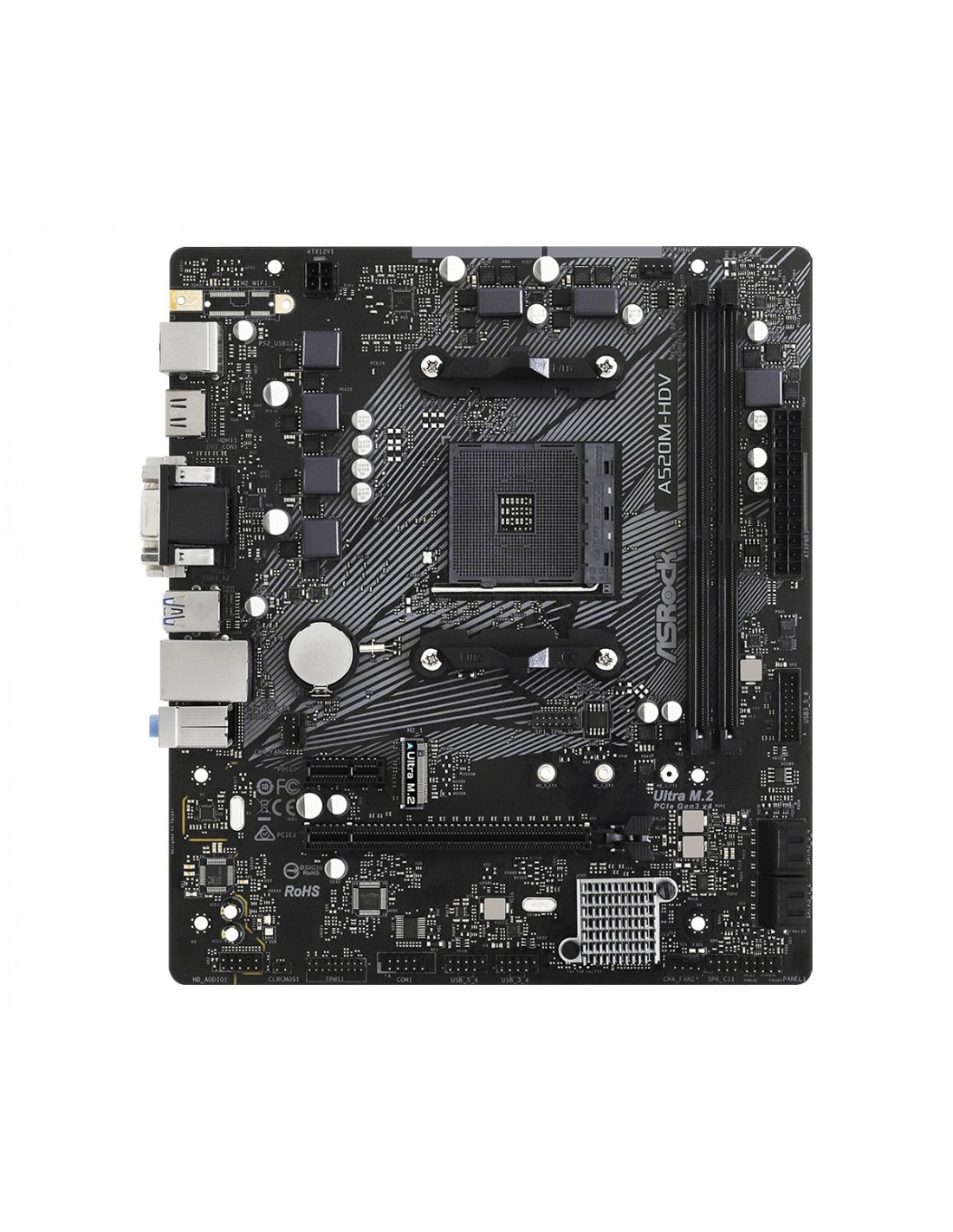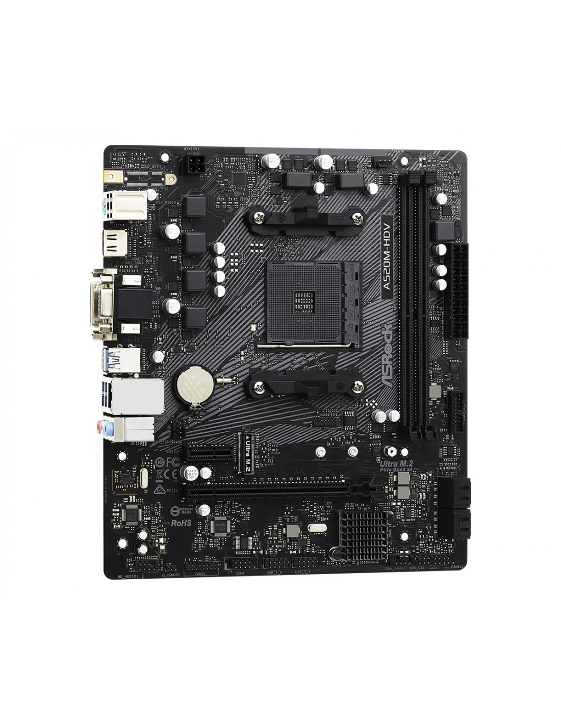 Asrock A520M-HDV. Fabricante de procesador: AMD, Socket de procesador: Zócalo AM4, Procesador compatible: AMD Ryzen 3 3rd Gen, 3rd Generation AMD Ryzen 5, 3rd Generation AMD Ryzen 7, 3rd Generation AMD.... tipos de memoria compatibles: DDR4-SDRAM, Tipo de ranuras de memoria: DIMM, Velocidades de reloj de memoria soportadas: 2133,2400,2666,2933,3200,3466,3600,3733,3800,3866,4000,4133,4200,4266,4333,4400,4466,4500,4533 MHz. Interfaces de disco de almacenamiento soportados: M.2, Serial ATA III. Graphics chipset: AMD, Adaptador gráfico: Radeon Vega. Tipo de interfaz ethernet: Gigabit Ethernet, Controlador LAN: Realtek RTL8111H