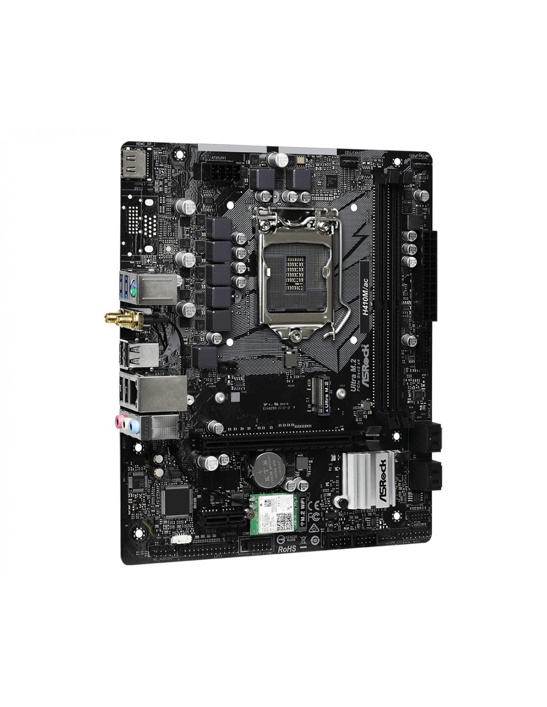 Asrock H410M/ac. Fabricante de procesador: Intel, Socket de procesador: LGA 1200, Procesador compatible: Intel® Celeron®, Intel® Core™ i3, Intel Core i5, Intel Core i7, Intel Core i9, Intel® Pentium®. tipos de memoria compatibles: DDR4-SDRAM, Tipo de ranuras de memoria: DIMM, Velocidades de reloj de memoria soportadas: 2133,2400,2666,2800,2933 MHz. Interfaces de disco de almacenamiento soportados: Serial ATA III, Tipos de unidades de almacenamiento admitidas: HDD & SSD. Máxima resolución: 4096 x 2160 Pixeles. Tipo de interfaz ethernet: Gigabit Ethernet, Controlador LAN: Intel® I219-V, Wi-Fi estándares: 802.11a,802.11b,802.11g,Wi-Fi 4 (802.11n),Wi-Fi 5 (802.11ac)