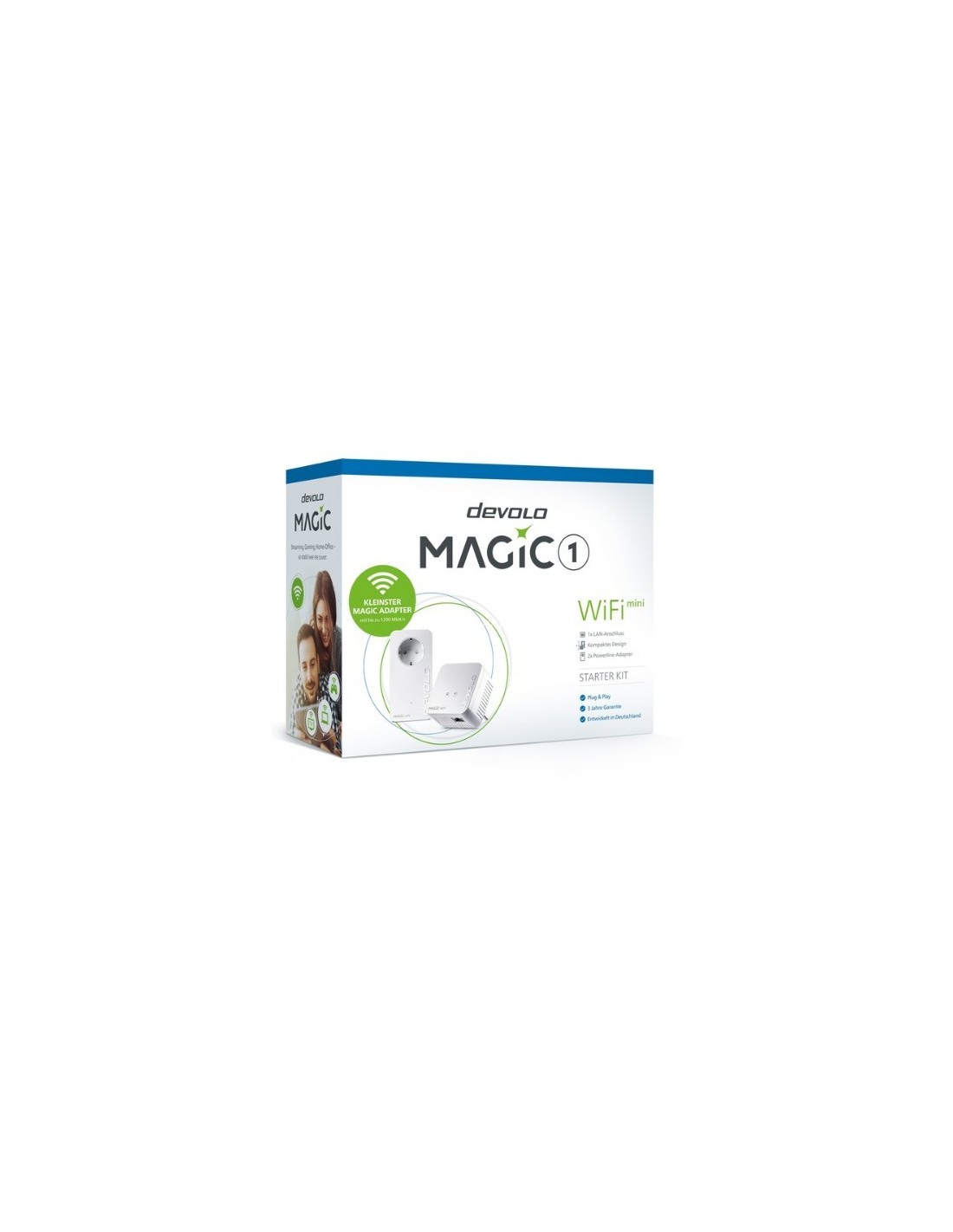 Devolo Magic 1 WiFi mini Starter Kit. Rango máximo de transferencia de datos: 1200 Mbit/s, Estándares de red: IEEE 802.11b, IEEE 802.11g, IEEE 802.11n, IEEE 802.1p, IEEE 802.3, IEEE 802.3az, IEEE 802.3u, IEEE..., Conector: Tipo C. Consumo energético: 4,4 W, Consumo de energía (inactivo): 1 W, Voltaje de entrada AC: 196 - 250 V. Color del producto: Blanco, Indicadores LED: PLC, WLAN. Sistema operativo Windows soportado: Windows 10, Windows 7, Windows 8, Windows 8.1, Sistema operativo Linux soportado: Ubuntu 16.04, Ubuntu 16.10, Ubuntu 17.10, Sistema operativo MAC soportado: Mac OS X 10.10 Yosemite, Mac OS X 10.11 El Capitan, Mac OS X 10.12 Sierra, Mac OS X 10.13 High.... Ancho: 68 mm, Profundidad: 41 mm, Altura: 68 mm