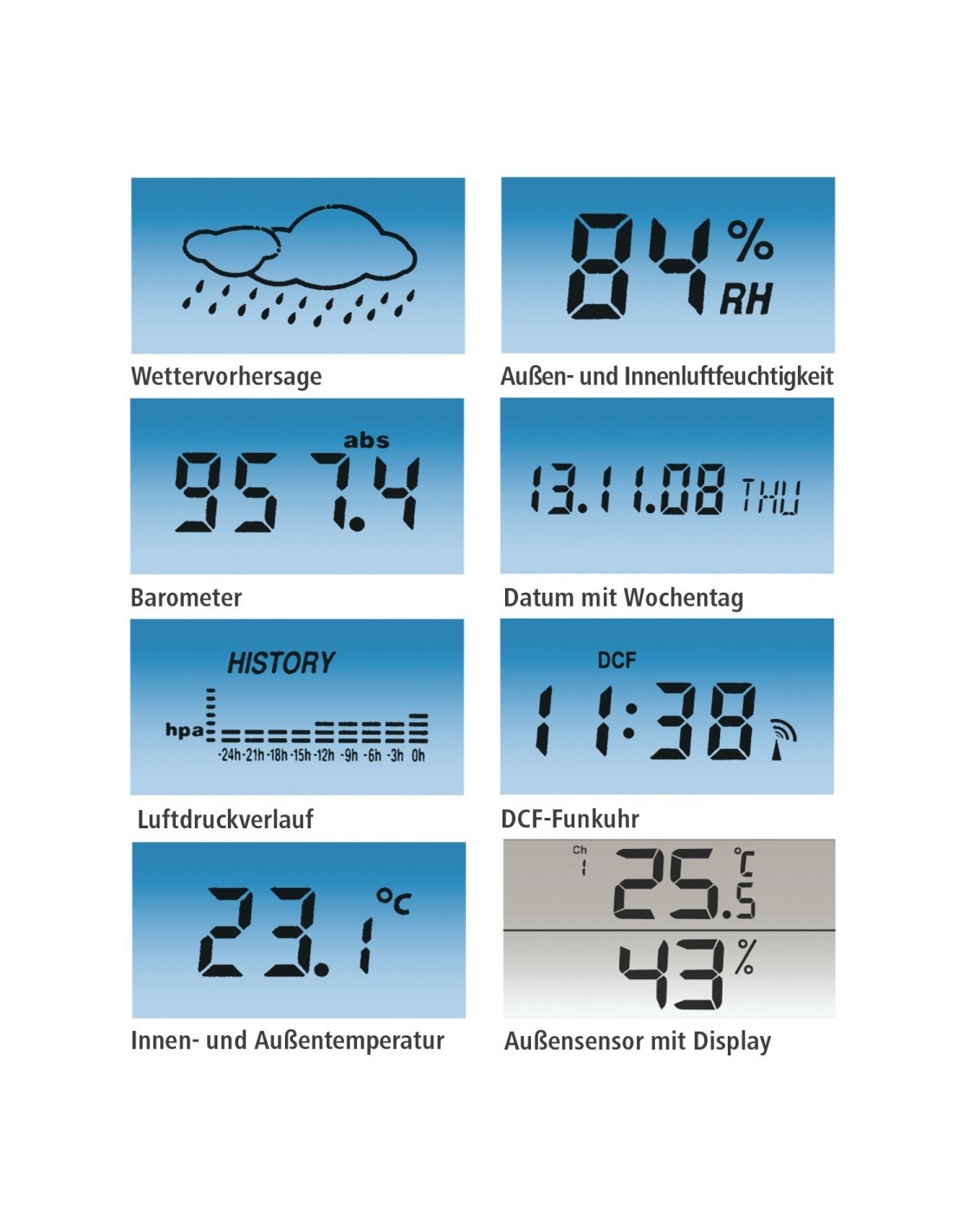 | Funciones de medición | Barómetro de interior, Termómetro de interior, Higrómetro de exterior, Termómetro para exteriores |