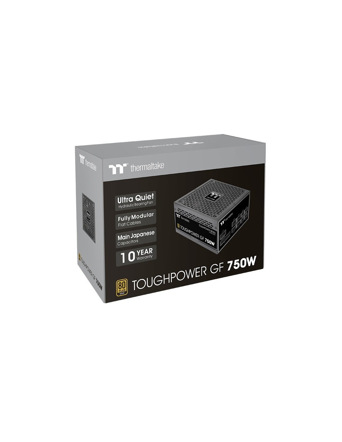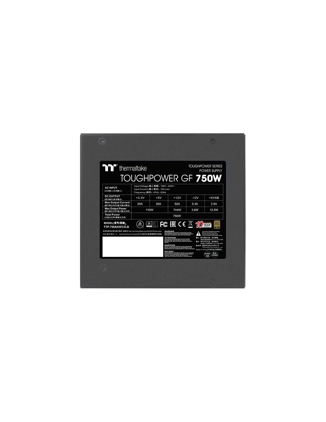 Thermaltake TTP-750AH3FCG-B. Potencia total: 750 W, Voltaje de entrada AC: 100 - 240 V, Máxima energía: 900 W. Alimentador de energía para tarjeta madre: 24-pin ATX, Longitud del cable de alimentación de la placa base: 60 cm, Longitud del cable de alimentación SATA: 500,650,800 mm. Utilizar con: PC, Factor de forma de fuente de alimentación (PSU): ATX, Certificación 80 PLUS: 80 PLUS Gold. Color del producto: Negro, Tipo de enfriamiento: Activo, Diámetro de ventilador: 14 cm. Cables incluidos: CPU, PCIe, Peripheral (Molex), SATA